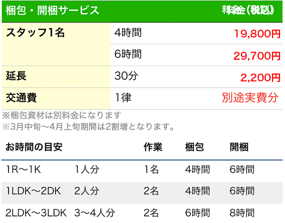 | 荷造りのみ(ファミリー) | 30,000円〜50,000円 | 前日または数日前実施。時間超過は30分ごとに+3,000円 |